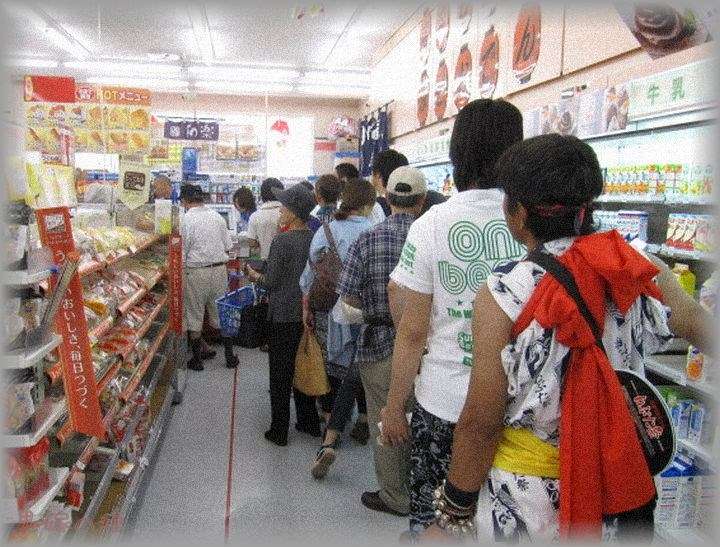 祭りの為に歩行者天国状態になった道路沿いにあったコンビニでの一こま。