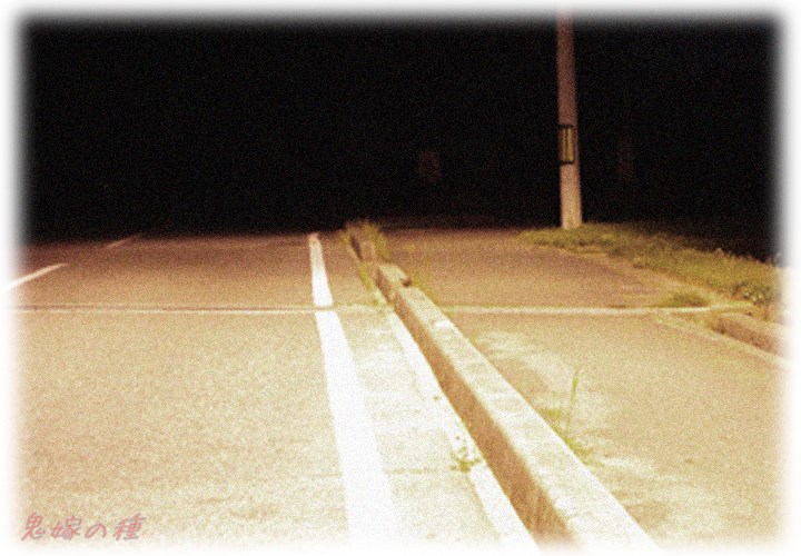 夜の田舎道、街灯なし・周りは田んぼ