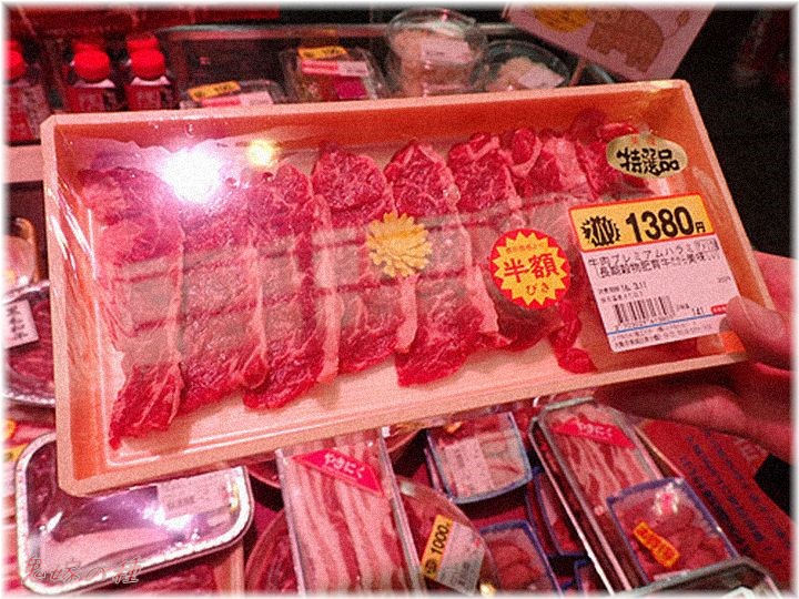 牛肉のパックに貼られた半額シールが貼り方が甘いやつが有った。