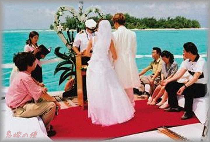 船上結婚式でのブーケトス。