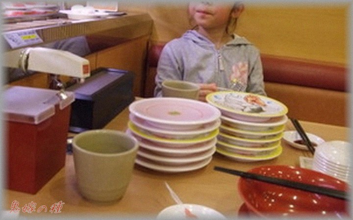 回転寿司のカウンターにて。