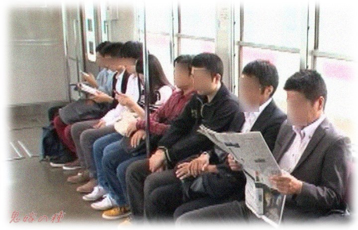 ちょっと暑かった日の夕方、電車で座席は全部埋まってる混み具合で、