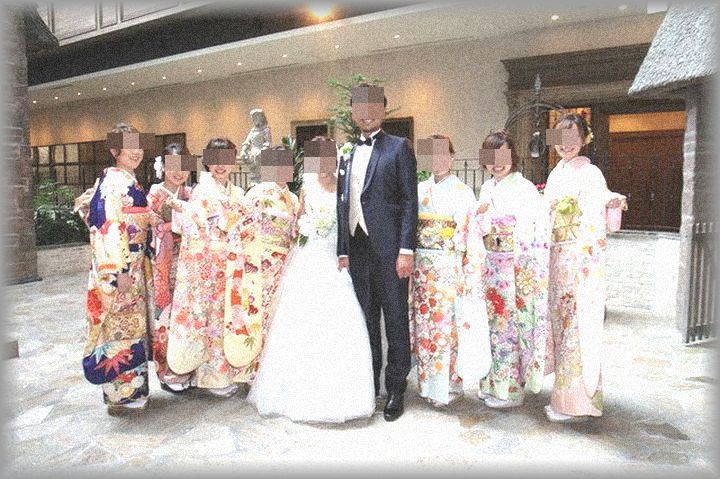 友人一同振袖で出席した披露宴。